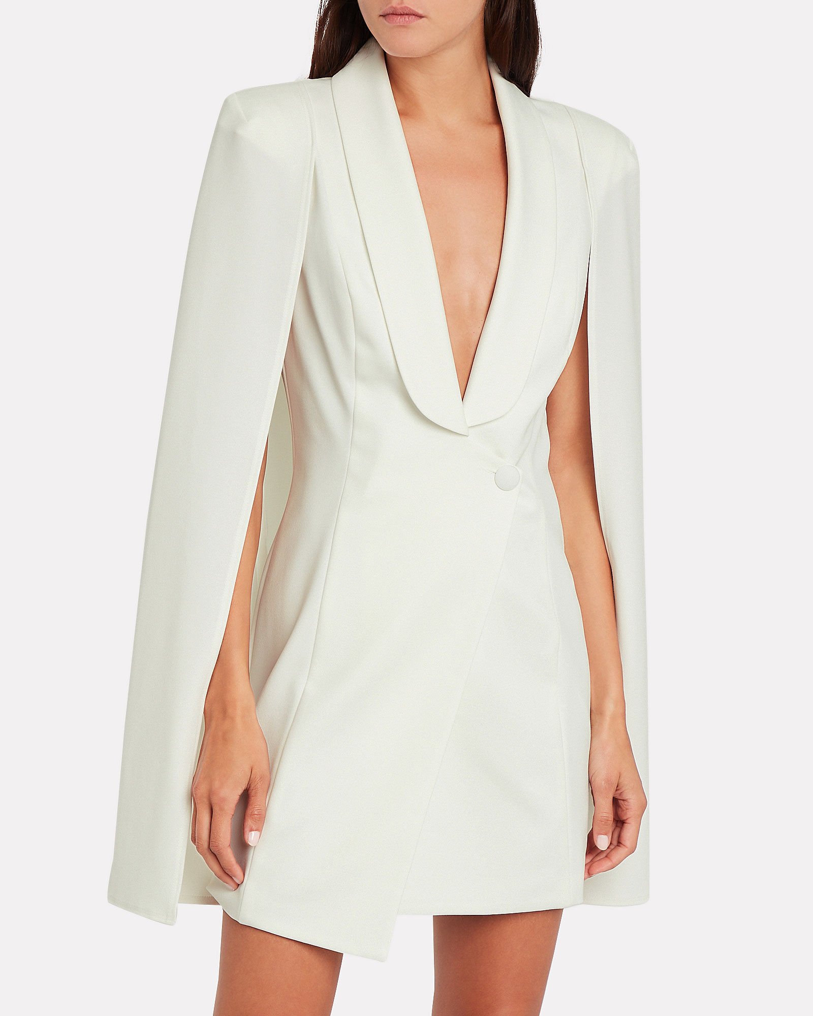 Perfect for slipping on to start the evening do, the Katie May’s Boss Lady dress is the ultimate in feminine rework of tailored suiting. Styled with a dramatic cape overlay and wrap silhouette this encapsulates what is a modern bride, the deep V is sexy while the sleeves are totally sleek. Business and bridal is the chicest way.