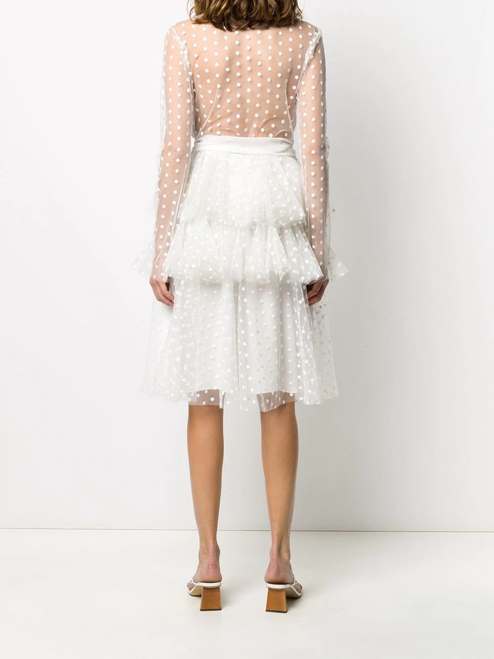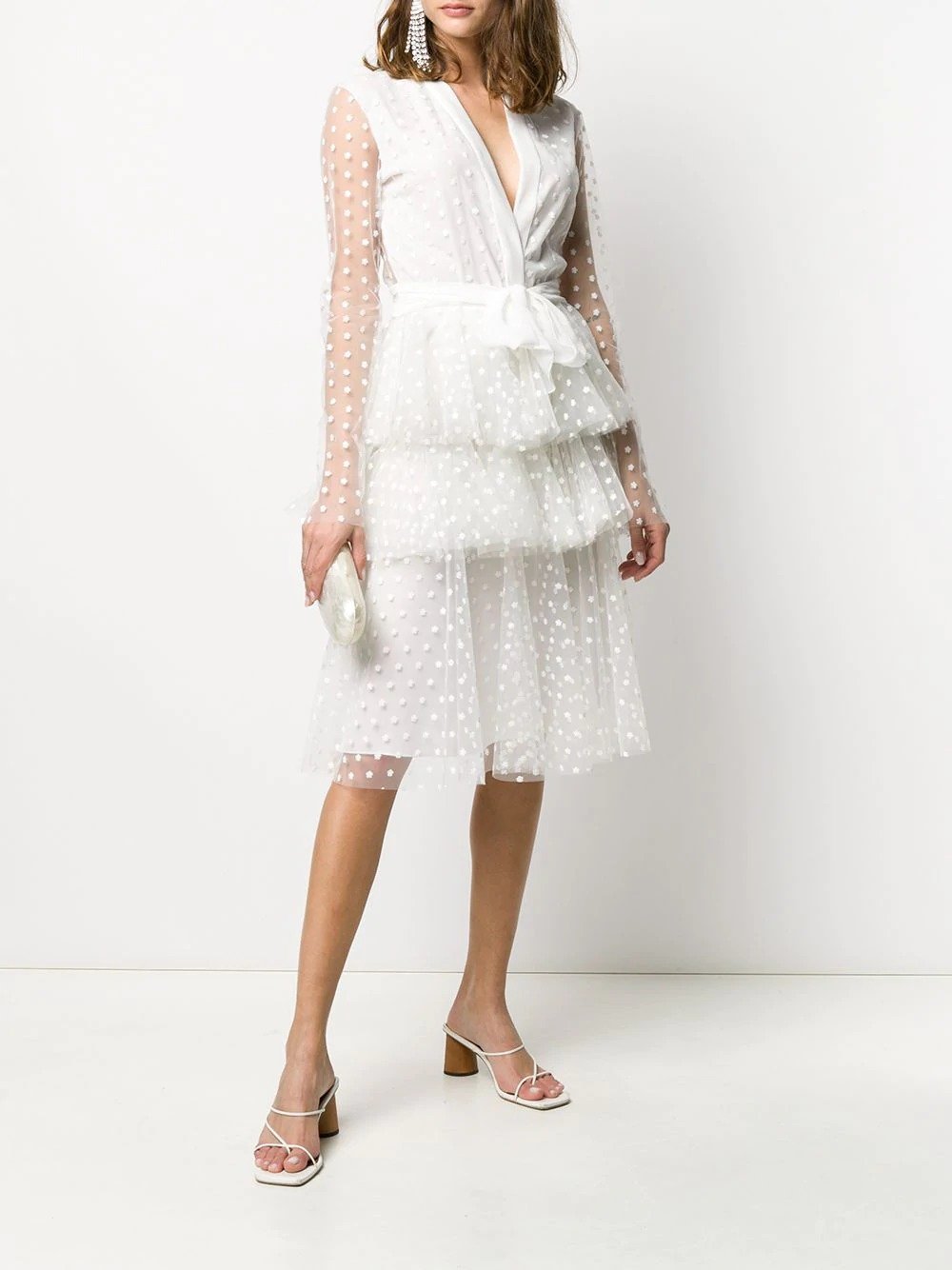 I absolutely love this three-tiered dress for a trip to the altar but it also has bridal shower written all over it. Between the polka dots, tulle and illusion sleeves, this gown is ultra-girly and fashion-forward.