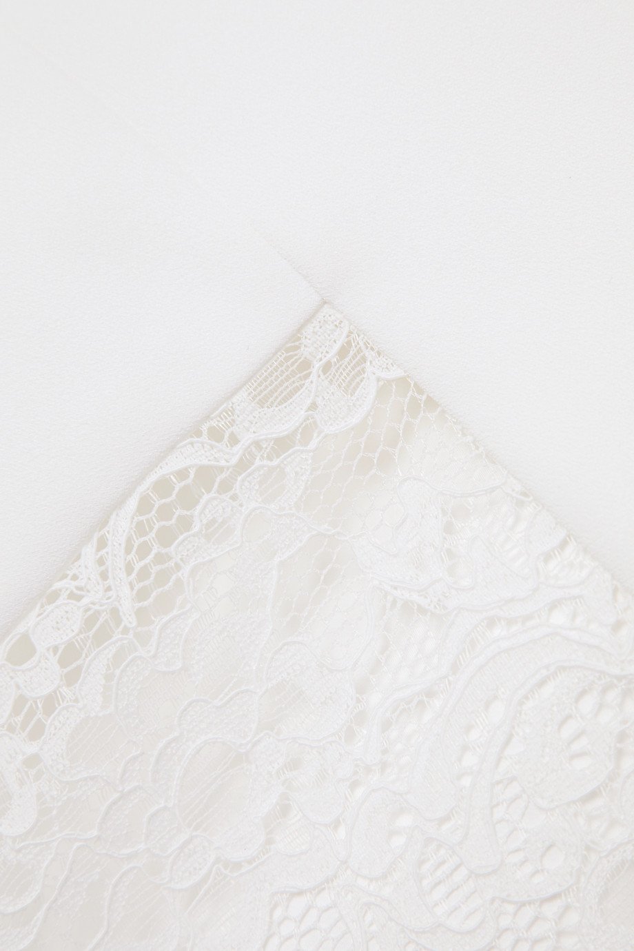 Thanks to the alternating crepe and lace panels, this short wedding dress gives the illusion of length. This asymmetric dress is cut to hug your frame and spliced to reveal flashes of skin. Wear yours for the big day with barely there sandals, a box clutch and some statement jewellery. This is a wow!